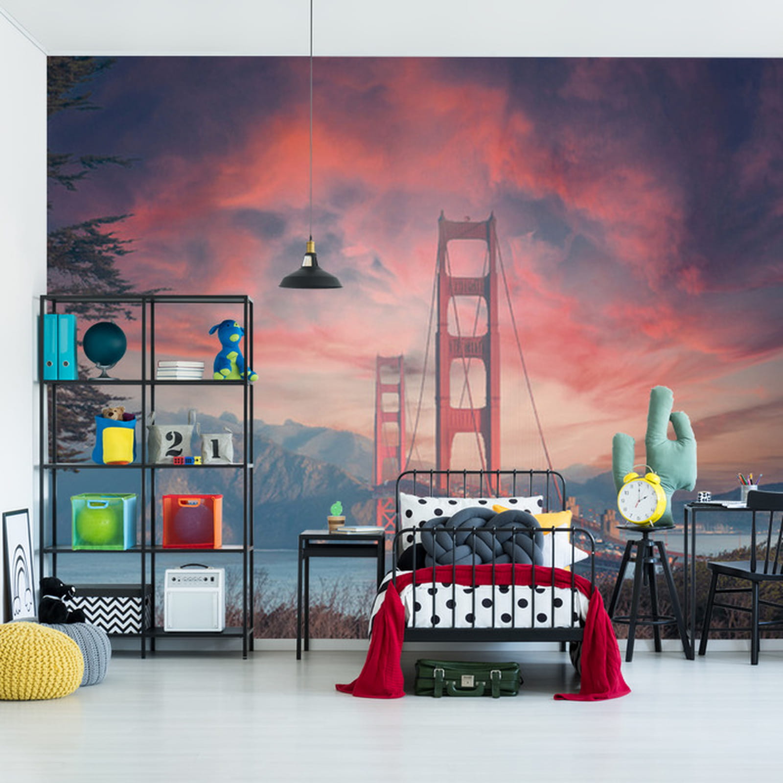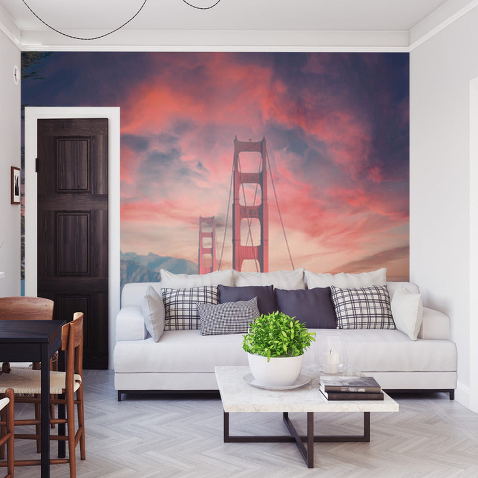 Fototapeta Beautiful View Of Golden Gate Bridge In Background Of Mountains During Sunset