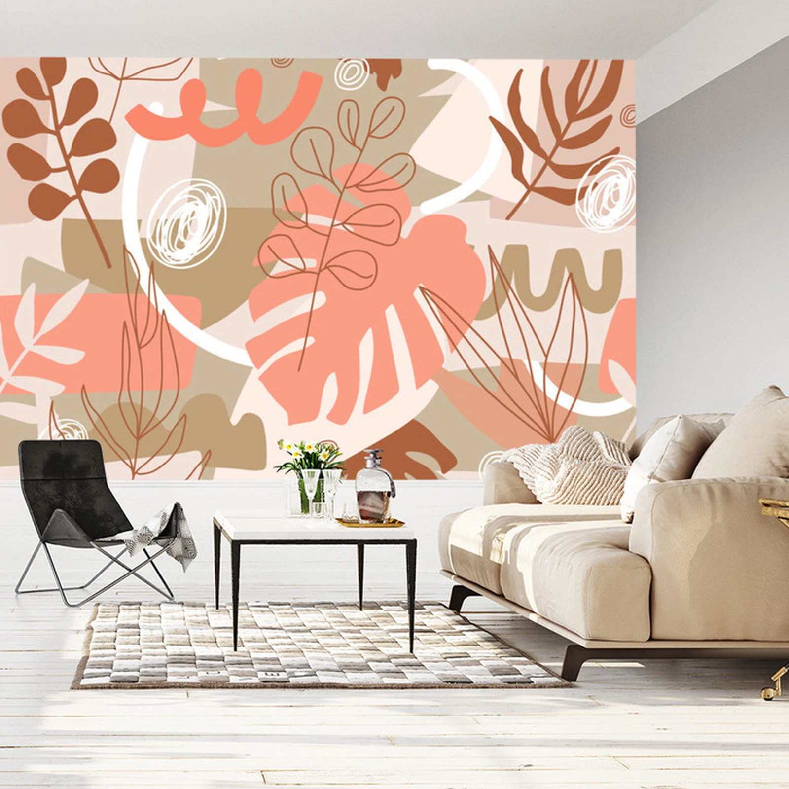 Fototapeta Contemporary Collage Seamless Pattern. Terracotta Abstract Shapes, Tropical Leaves And Continuous Line Of Leaf. Texture For Textile, Packaging, Wrapping Paper, Social Media Post Etc.