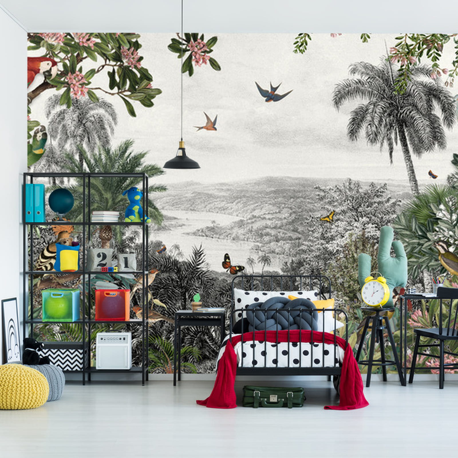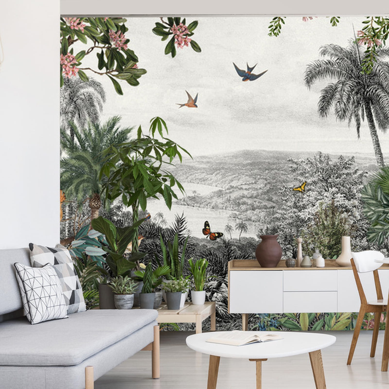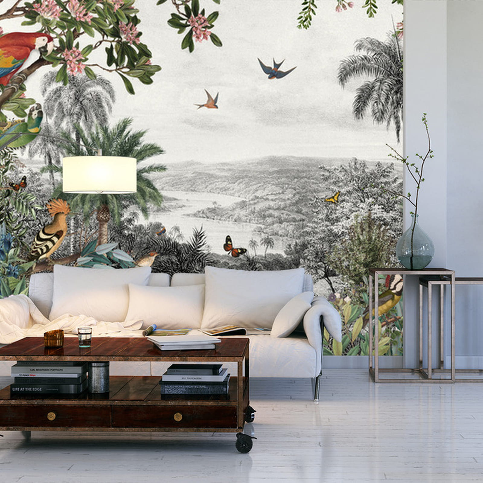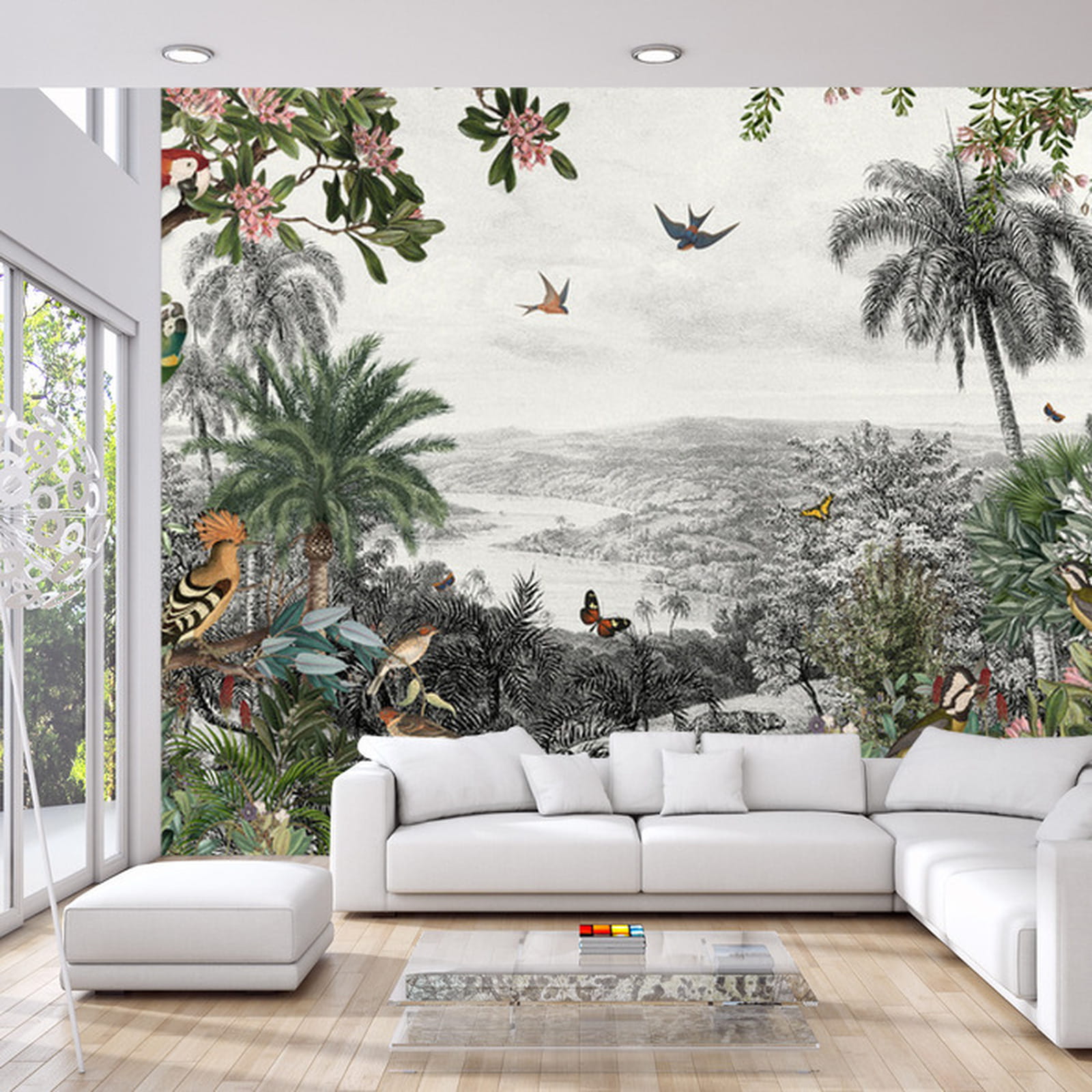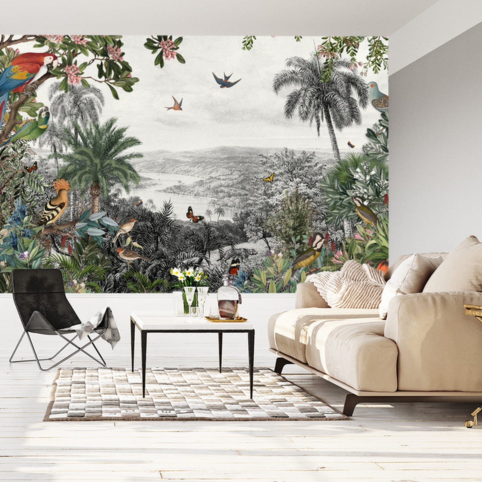 Fototapeta Tropical Jungle Wallpaper Palm Trees, Birds And Parrot In The River Land With Flying Butterflies