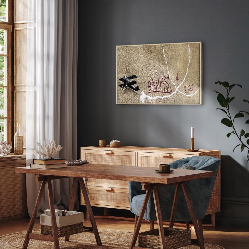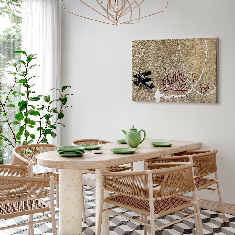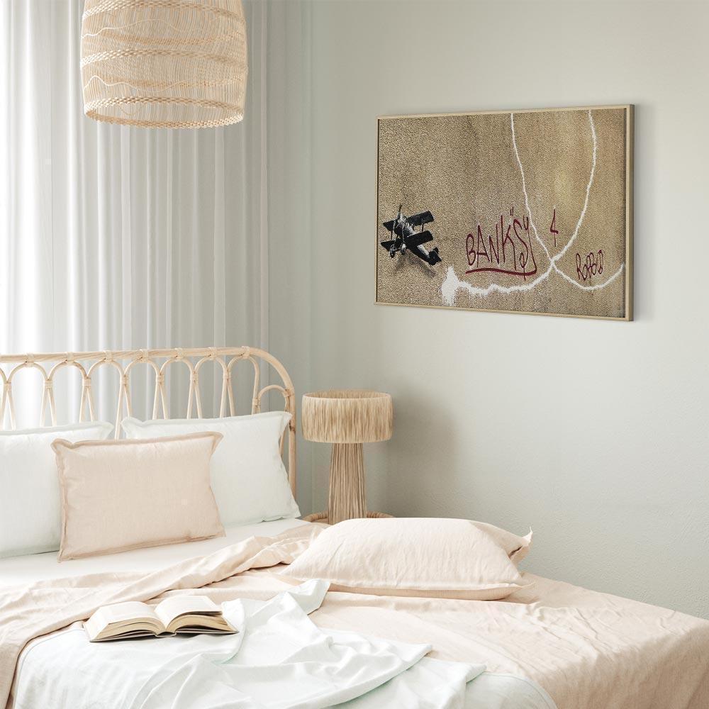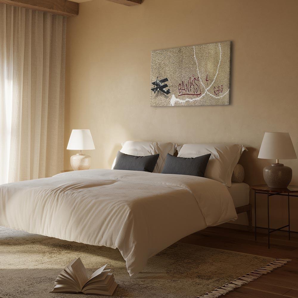 Niepowtarzalne obrazy z estetycznymi motywami są idealnym dopełnieniem eleganckiej aranżacji. Przy odrobinie kreatywności można je z łatwością dopasować do wnętrza urządzonego w każdym stylu. Obraz na płótnie "Obraz - Samolot Banksy (1-częściowy) - graffiti czerwone napisy na tle muralu" to unikalny element dekoracyjny który jest niemal uniwersalny. Przypadnie do gustu każdemu, kto poszukuje oryginalnych ozdób, aby dopełnić swoją aranżację. Umieść go w swoim wnętrzu, a przekonasz się, że jest już kompletne i nie potrzebujesz już innych dodatków. Nie musisz się obawiać o jakość i wygląd swojej dekoracji. Dostępne w ofercie obrazy na płótnie wiernie odwzorowują detale. Odpowiednio dostosowana rozdzielczość druku gwarantuje intensywność kolorów oraz ostrość prezentowanego motywu. Tego typu produkty to doskonałe rozwiązanie, jeśli wciąż narzekasz na puste miejsce na ścianie i zastanawiasz się, jak je wypełnić. To stylowy element dekoracyjny, dzięki któremu wnętrze staje się wyjątkowo przytulne.