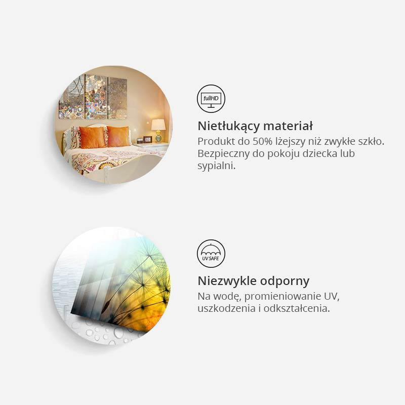 Obrazy na szkle akrylowym zachowują wszystkie zalety klasycznego druku na szkle, z pominięciem jego słabych stron – ciężkości i delikatności. Tworzy się je z wyjątkowo cenionego w architekturze wnętrz materiału, polimetakrylanu metylu. Polimer zwany potocznie szkłem akrylowym lub pleksi, jest (podobnie jak szkło) bezbarwny i sztywny. Tak jak szkło nie odbarwia się pod wpływem promieniowania UV i cechuje się bardzo wysoką (ponad 90%) przepuszczalnością światła. W odróżnieniu od szkła jest o połowę lżejszy i zdecydowanie bardziej wytrzymały. Jest bardziej elastyczny i ciężko go skruszyć. W przypadku obrazów na szkle akrylowym druk umieszczany jest jako foliowa okleina. Technika ta zapewnia fotograficzną dokładność i nasycone barwy. Obraz na pleksi gwarantuje trójwymiarową głębię i delikatny połysk.