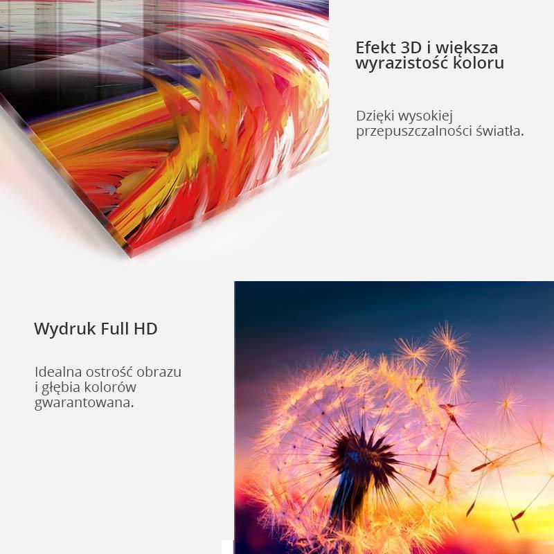Obrazy na szkle akrylowym zachowują wszystkie zalety klasycznego druku na szkle, z pominięciem jego słabych stron – ciężkości i delikatności. Tworzy się je z wyjątkowo cenionego w architekturze wnętrz materiału, polimetakrylanu metylu. Polimer zwany potocznie szkłem akrylowym lub pleksi, jest (podobnie jak szkło) bezbarwny i sztywny. Tak jak szkło nie odbarwia się pod wpływem promieniowania UV i cechuje się bardzo wysoką (ponad 90%) przepuszczalnością światła. W odróżnieniu od szkła jest o połowę lżejszy i zdecydowanie bardziej wytrzymały. Jest bardziej elastyczny i ciężko go skruszyć. W przypadku obrazów na szkle akrylowym druk umieszczany jest jako foliowa okleina. Technika ta zapewnia fotograficzną dokładność i nasycone barwy. Obraz na pleksi gwarantuje trójwymiarową głębię i delikatny połysk.
