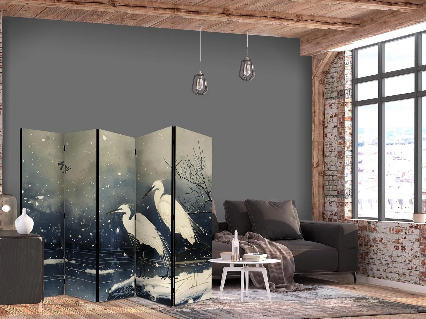 Parawan - Czaple nad zimowym stawem - ilustracja w stylu japońskiego w ciemnej kolorystyce