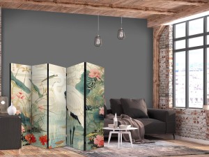 Parawan "Parawan - Nad azjatyckim stawem - ilustracja w stylu japońskiej ryciny, przedstawiająca czaplę" to element wyposażenia dający wiele możliwości. Cechuje go m.in. praktyczność. Jego podstawowym zadaniem jest podzielenie przestrzeni na kilka stref w dyskretny i estetyczny sposób. Parawany pokojowe pozwalają na odseparowanie w ciekawy sposób części przeznaczonej do relaksu od tej wyznaczonej do pracy. Dlatego często znajdują one zastosowanie w salonie. Parawany pozwalają też na sprytne ukrycie czegoś, co nie powinno być w pełni widoczne, przykładowo stojaka z ubraniami czy też suszarki z praniem. Można wykorzystać je więc na różne sposoby, zależnie od własnych potrzeb i wymagań. Dostępne w naszej ofercie parawany pokojowe to flizelinowe płótno zamocowane na drewnianym stelażu. Wyróżniają się bardzo solidną konstrukcją, a do wyboru są dwa formaty: 3-częściowy oraz 5-częściowy. Poszczególne elementy są ze sobą połączone za pomocą metalowych, mocnych zawiasów. Złożenie i rozłożenie parawanu nie stanowi żadnego problemu.