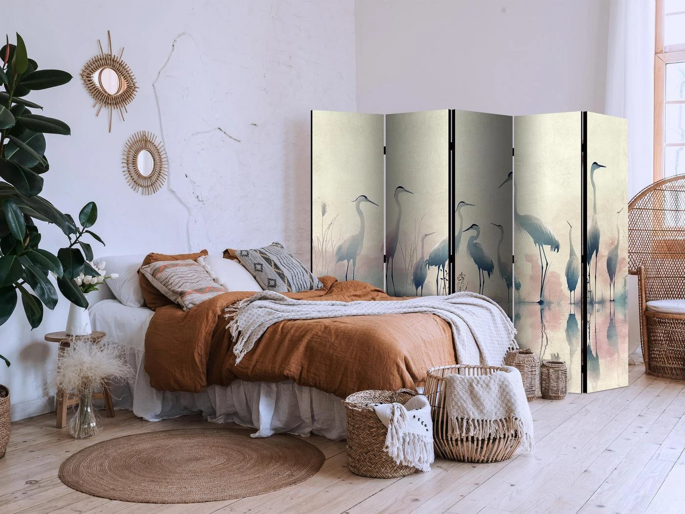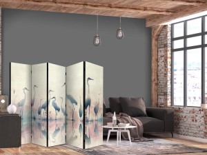 Parawan "Parawan - Ptaki nad jeziorem - czaple malowane akwarelą w delikatnej, szaro-różowej kolorystyce" to element wyposażenia dający wiele możliwości. Cechuje go m.in. praktyczność. Jego podstawowym zadaniem jest podzielenie przestrzeni na kilka stref w dyskretny i estetyczny sposób. Parawany pokojowe pozwalają na odseparowanie w ciekawy sposób części przeznaczonej do relaksu od tej wyznaczonej do pracy. Dlatego często znajdują one zastosowanie w salonie. Parawany pozwalają też na sprytne ukrycie czegoś, co nie powinno być w pełni widoczne, przykładowo stojaka z ubraniami czy też suszarki z praniem. Można wykorzystać je więc na różne sposoby, zależnie od własnych potrzeb i wymagań. Dostępne w naszej ofercie parawany pokojowe to flizelinowe płótno zamocowane na drewnianym stelażu. Wyróżniają się bardzo solidną konstrukcją, a do wyboru są dwa formaty: 3-częściowy oraz 5-częściowy. Poszczególne elementy są ze sobą połączone za pomocą metalowych, mocnych zawiasów. Złożenie i rozłożenie parawanu nie stanowi żadnego problemu.