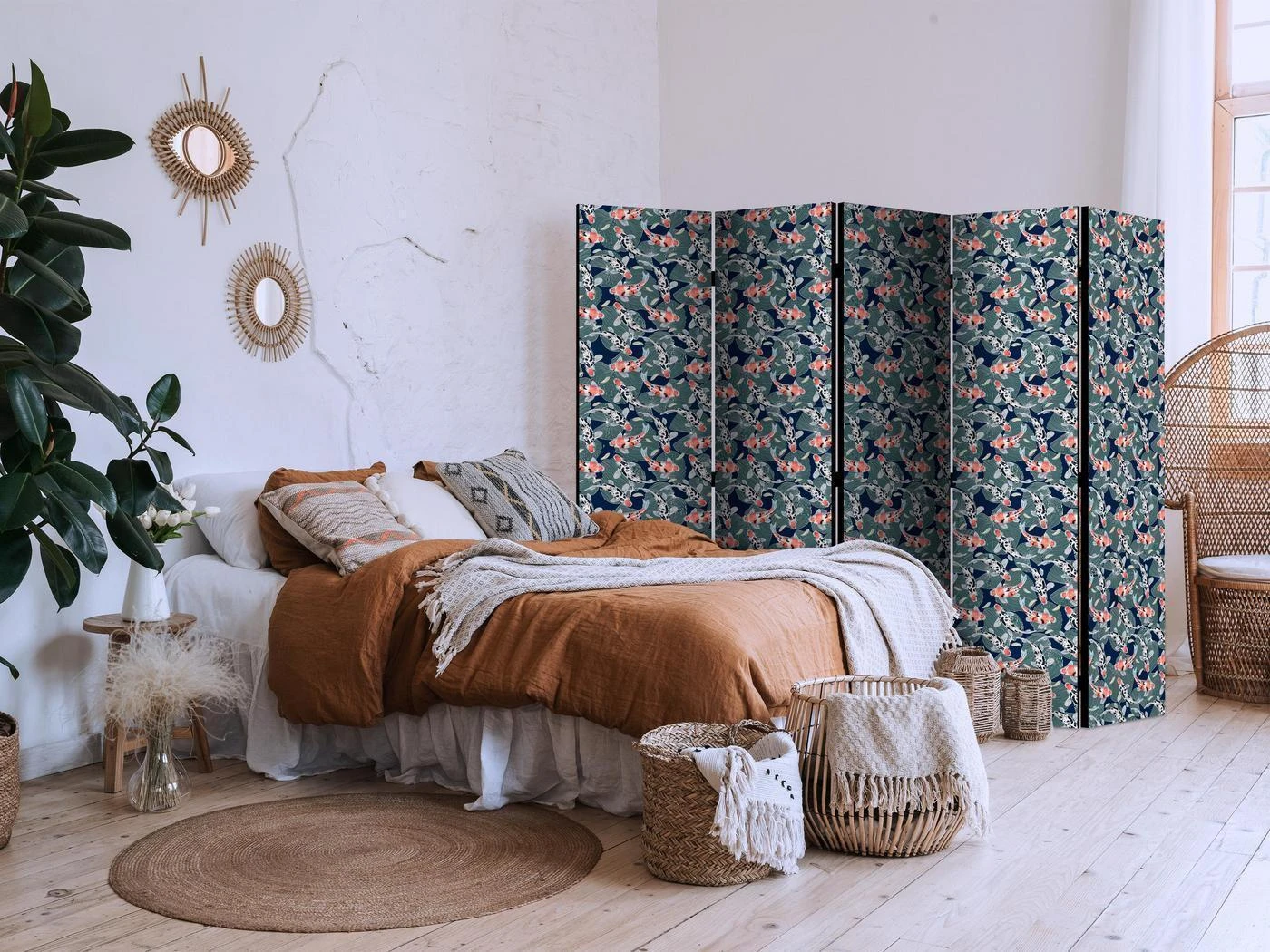 Parawan "Parawan - Rybki wśród liści - Barwne rybki Koi wśród ciemnozielonych lisci nenufarów na tafli granatowej wody" to element wyposażenia dający wiele możliwości. Cechuje go m.in. praktyczność. Jego podstawowym zadaniem jest podzielenie przestrzeni na kilka stref w dyskretny i estetyczny sposób. Parawany pokojowe pozwalają na odseparowanie w ciekawy sposób części przeznaczonej do relaksu od tej wyznaczonej do pracy. Dlatego często znajdują one zastosowanie w salonie. Parawany pozwalają też na sprytne ukrycie czegoś, co nie powinno być w pełni widoczne, przykładowo stojaka z ubraniami czy też suszarki z praniem. Można wykorzystać je więc na różne sposoby, zależnie od własnych potrzeb i wymagań. Dostępne w naszej ofercie parawany pokojowe to flizelinowe płótno zamocowane na drewnianym stelażu. Wyróżniają się bardzo solidną konstrukcją, a do wyboru są dwa formaty: 3-częściowy oraz 5-częściowy. Poszczególne elementy są ze sobą połączone za pomocą metalowych, mocnych zawiasów. Złożenie i rozłożenie parawanu nie stanowi żadnego problemu.