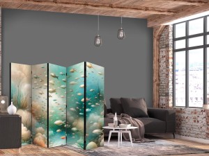 Parawan "Parawan - Zjawiskowy podwodny krajobraz - Ryby w podwodnym świecie w kolorach turkusu błękitu beżu i delikatnego pomarańczowego" to element wyposażenia dający wiele możliwości. Cechuje go m.in. praktyczność. Jego podstawowym zadaniem jest podzielenie przestrzeni na kilka stref w dyskretny i estetyczny sposób. Parawany pokojowe pozwalają na odseparowanie w ciekawy sposób części przeznaczonej do relaksu od tej wyznaczonej do pracy. Dlatego często znajdują one zastosowanie w salonie. Parawany pozwalają też na sprytne ukrycie czegoś, co nie powinno być w pełni widoczne, przykładowo stojaka z ubraniami czy też suszarki z praniem. Można wykorzystać je więc na różne sposoby, zależnie od własnych potrzeb i wymagań. Dostępne w naszej ofercie parawany pokojowe to flizelinowe płótno zamocowane na drewnianym stelażu. Wyróżniają się bardzo solidną konstrukcją, a do wyboru są dwa formaty: 3-częściowy oraz 5-częściowy. Poszczególne elementy są ze sobą połączone za pomocą metalowych, mocnych zawiasów. Złożenie i rozłożenie parawanu nie stanowi żadnego problemu.