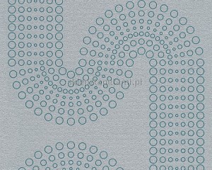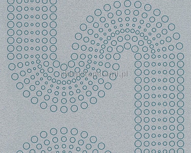 Tapeta ścienna zmywalna na flizelinie. Wzór geometryczny utworzony z turkusowych kółeczek na srebrnym tle.