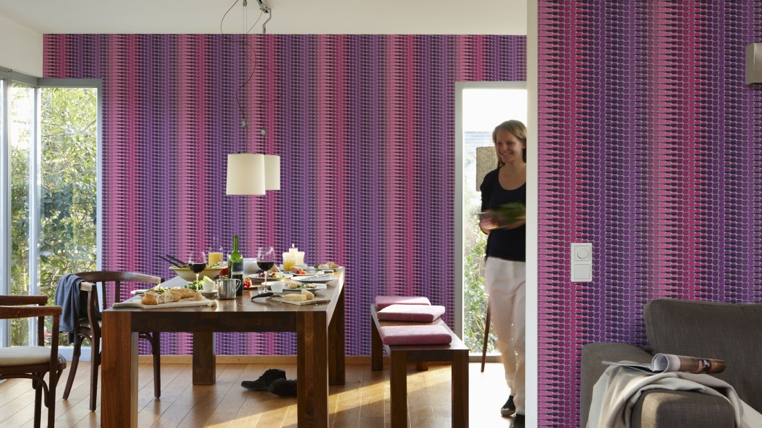 Opis: Nowoczesny wzór geometryczny przypominający pasy, który daje efekt 3D w odcieniach różu oraz fioletu. Struktura tapety przypomina lekki "grysik". Świetnie ożywi każde wnętrze oraz nada niepowtarzalny charakter. Sprawdzi się zarówno w pokoju, salonie jak i kuchni oraz w przedpokoju.