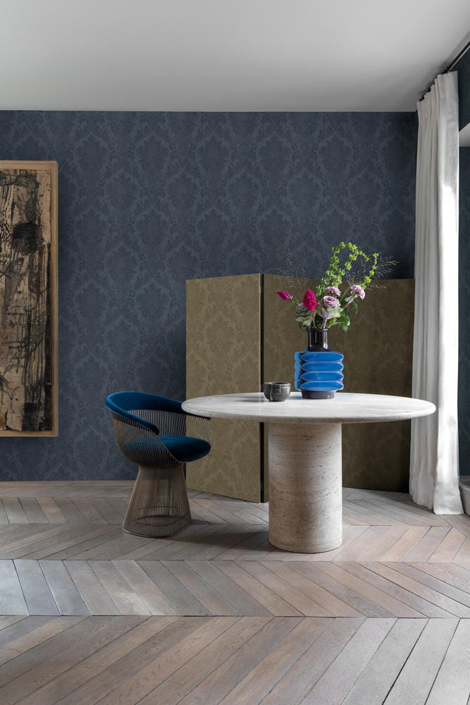 Tapeta winylowa na flizelinie ornament granatowy glamour. Sugerowane zastosowanie: pokój, przedpokój, kuchnia.