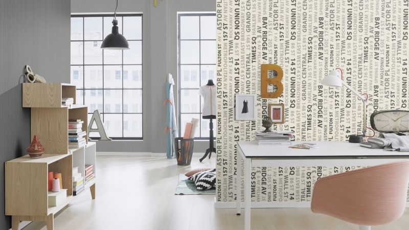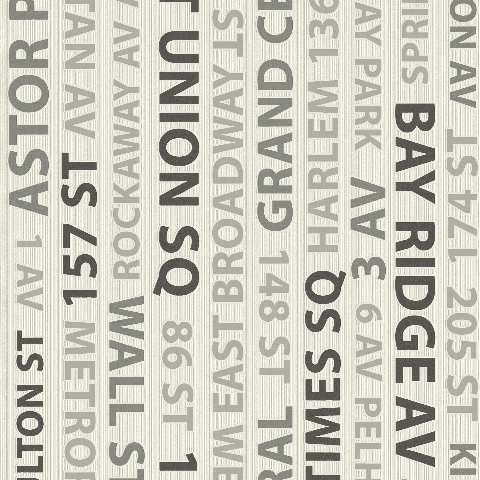 TAPETA RASCH 432817 SIGHTSEENING Napisy w języku angielskim - szare, czarne na kremowym tle