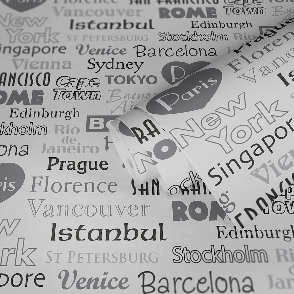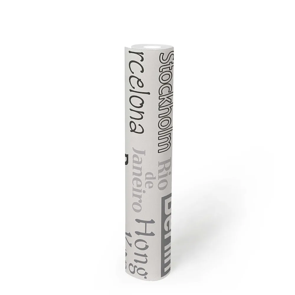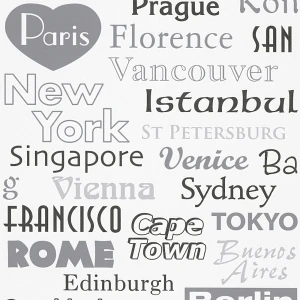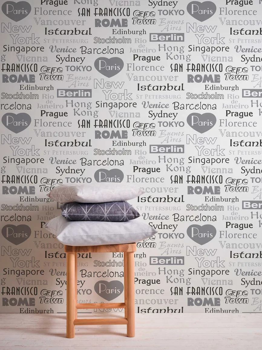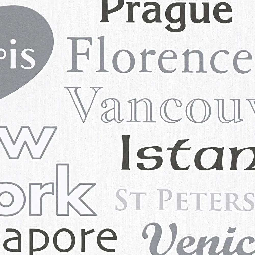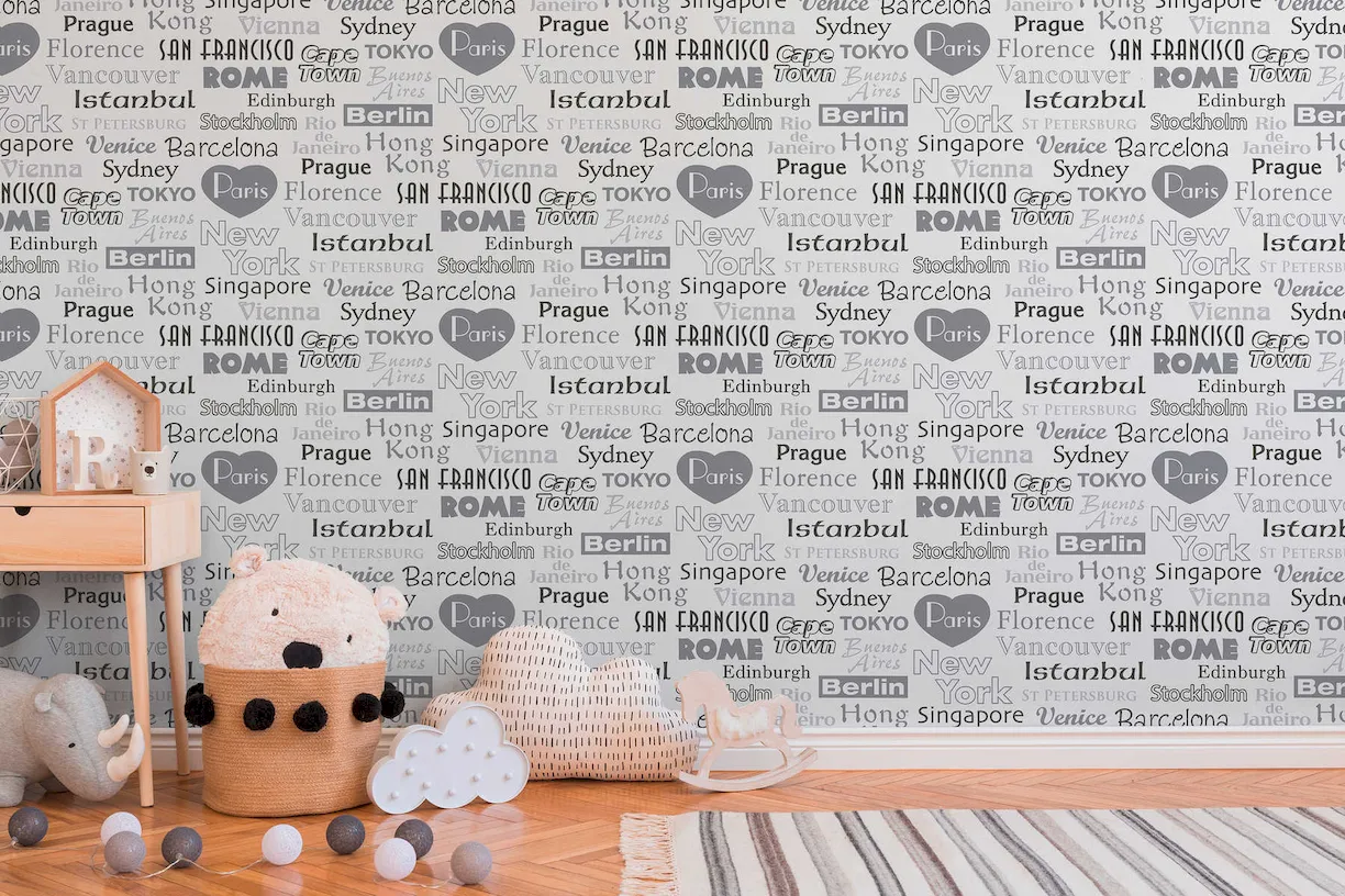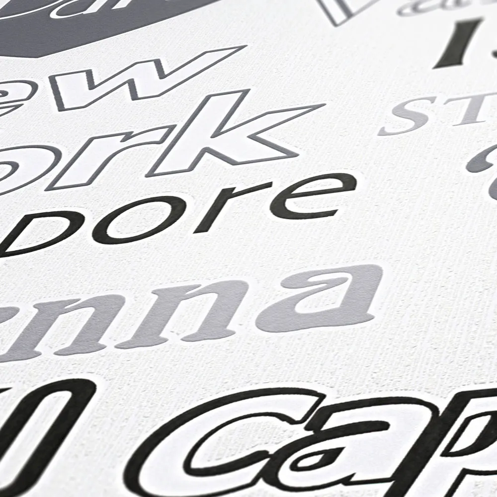Tapeta 30467-1 z kolekcji Boys & Girls 6 A.S. Creation. Napisy przedstawiające nazwy popularnych miast w kolorach czarnym, białym i szarym. Dsokonale sprawdzi się w salonie, kuchni, przedpokoju lub sypialni.