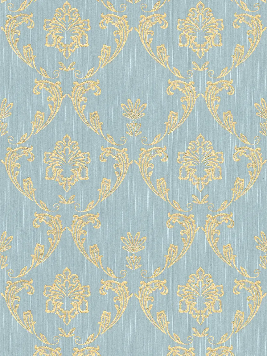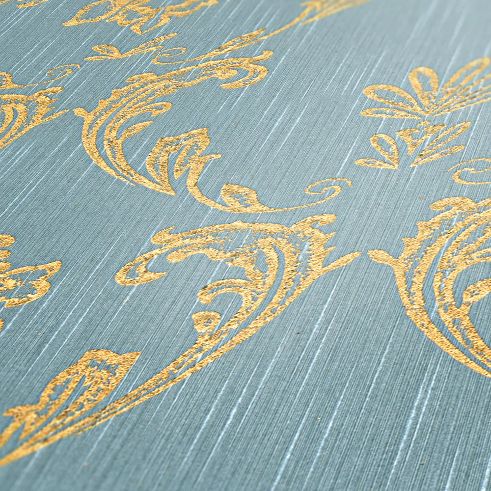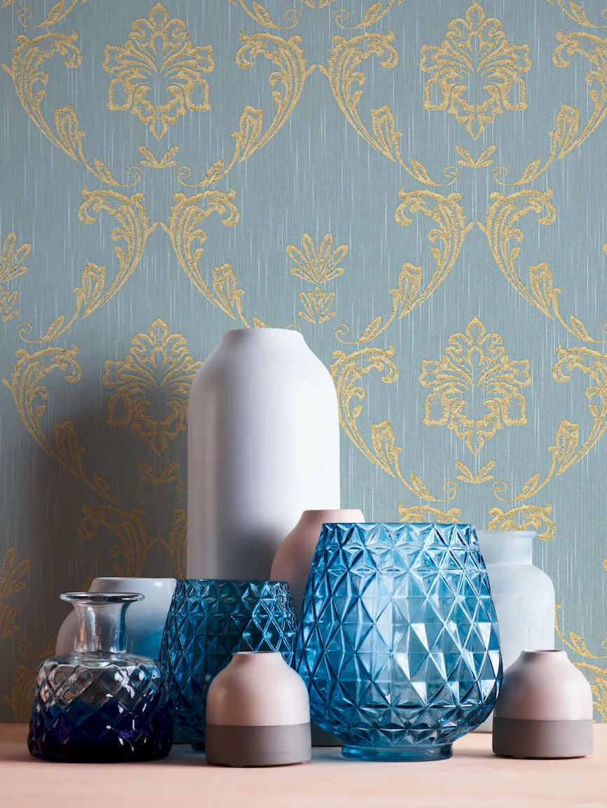 Tapeta 30658-6 AP Metallic Silk AS Creation ornament z kwiatowymi elementami w kolorze złotym - złotym, niebieskim, zielonym