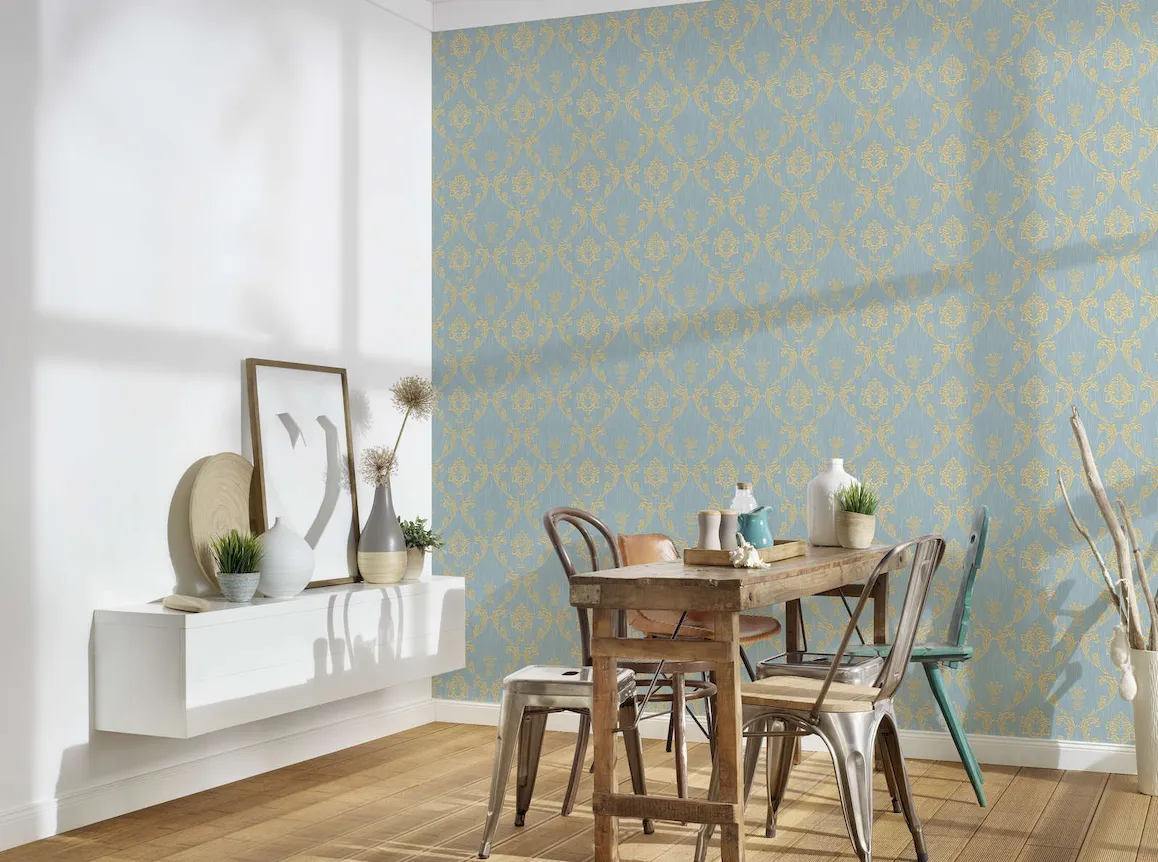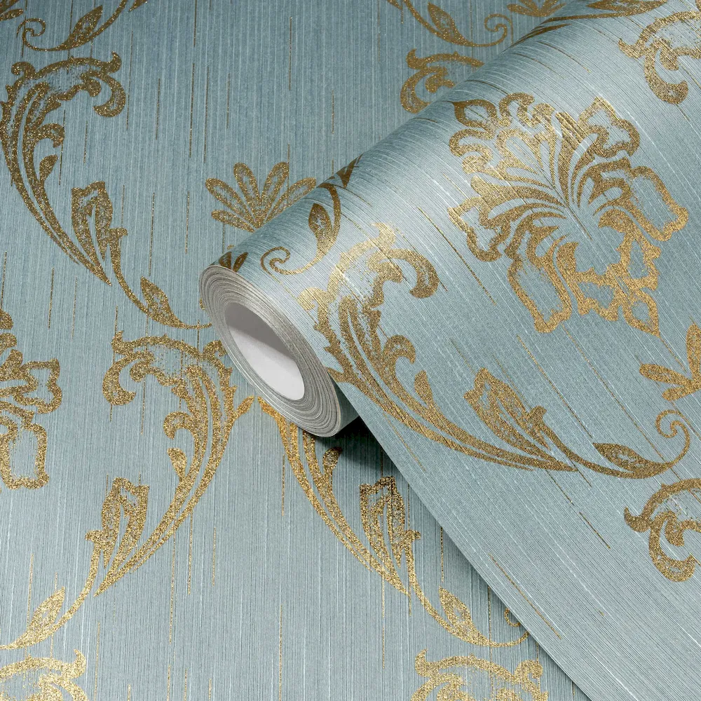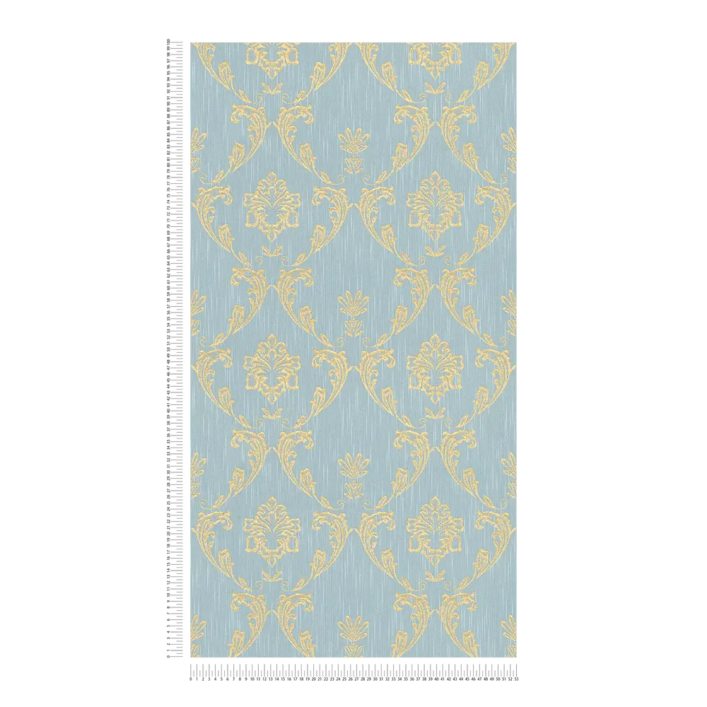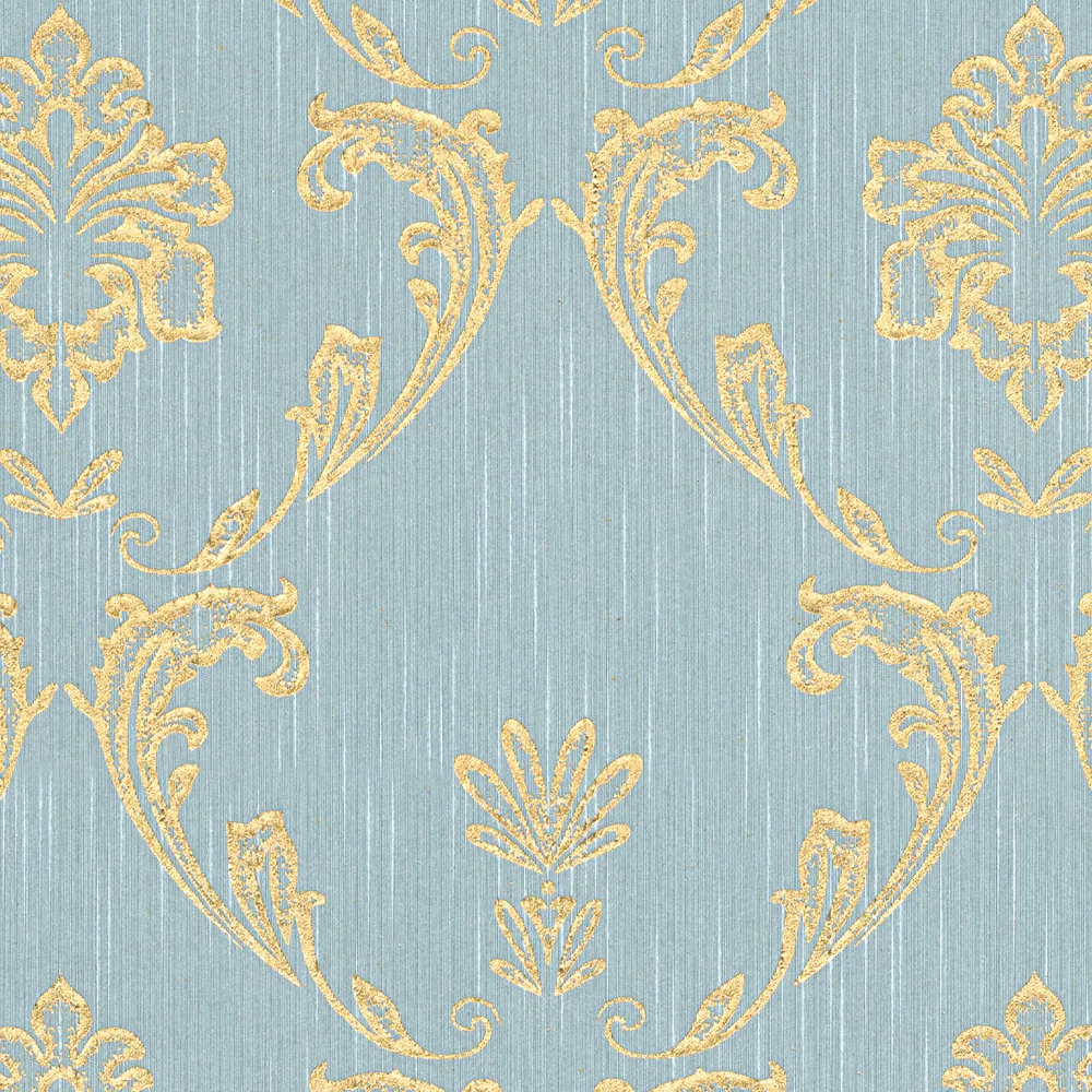 Tapeta 30658-6 AP Metallic Silk AS Creation ornament z kwiatowymi elementami w kolorze złotym - złotym, niebieskim, zielonym