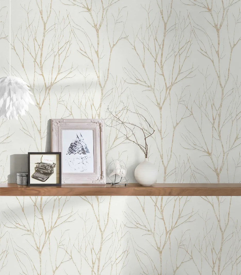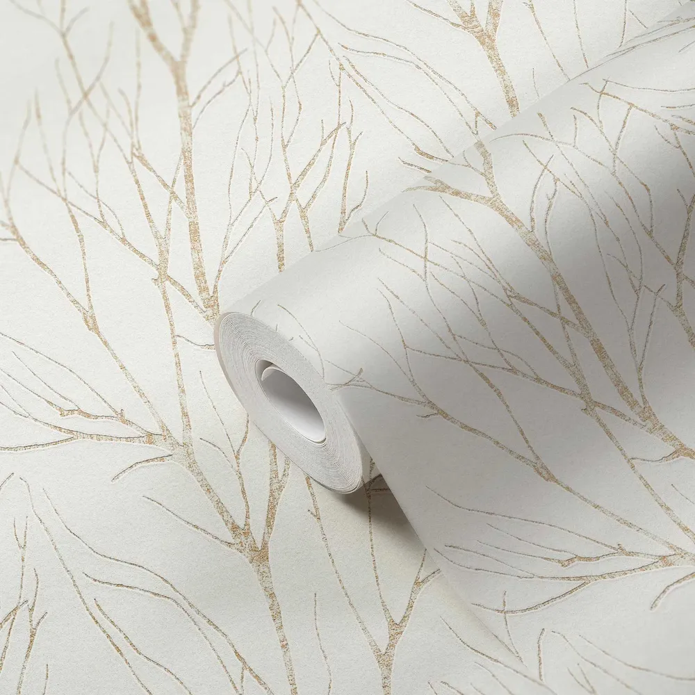 Wzór gałęzi symbolizuje naturę i harmonię, co sprawia, że tapeta idealnie wpisuje się w aktualne trendy wnętrzarskie. Złote detale dodają całości luksusowego wyrazu, co czyni ją idealnym rozwiązaniem zarówno do nowoczesnych, jak i klasycznych aranżacji. Tapeta doskonale sprawdzi się w salonie, sypialni czy biurze, wprowadzając do przestrzeni przytulny, a zarazem elegancki klimat.