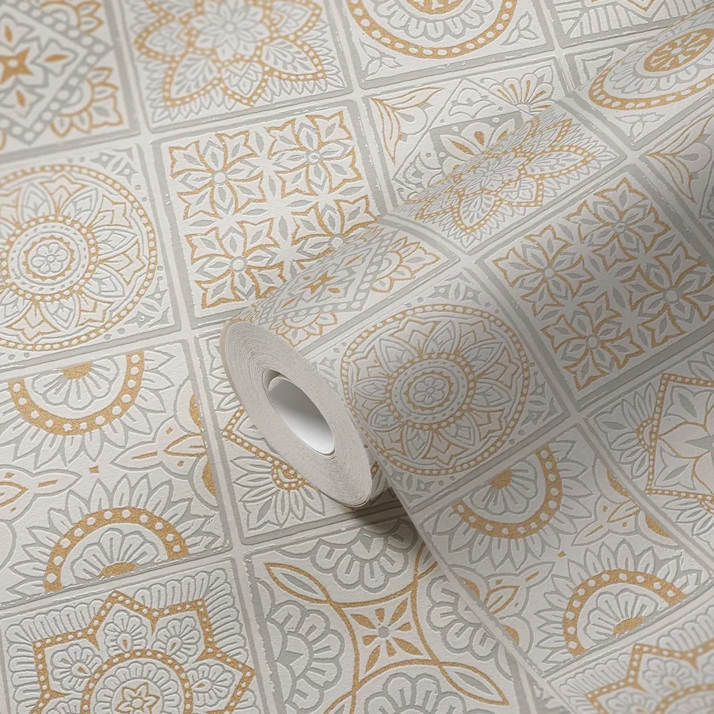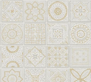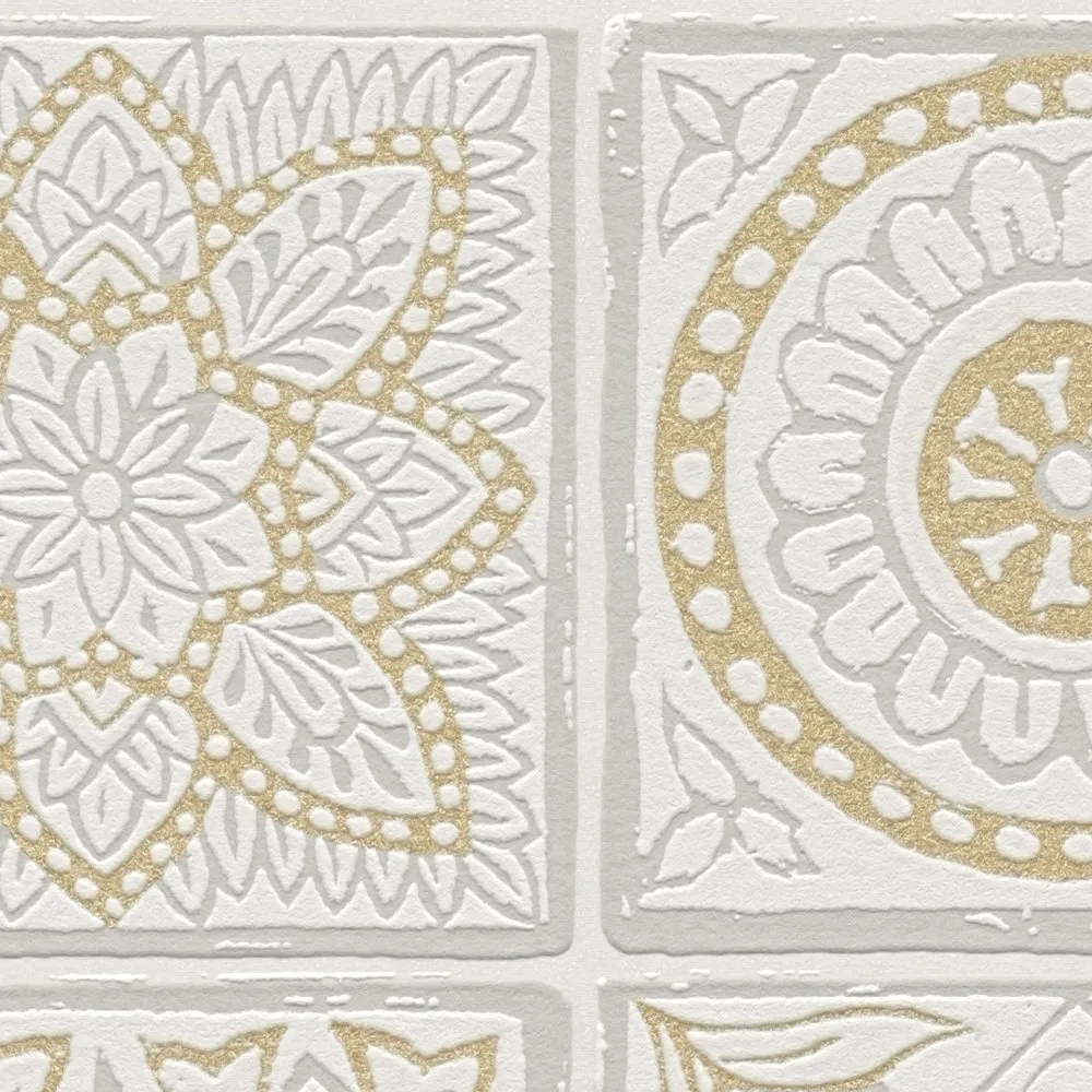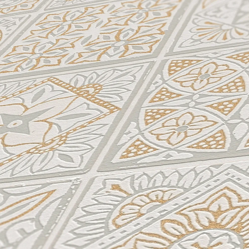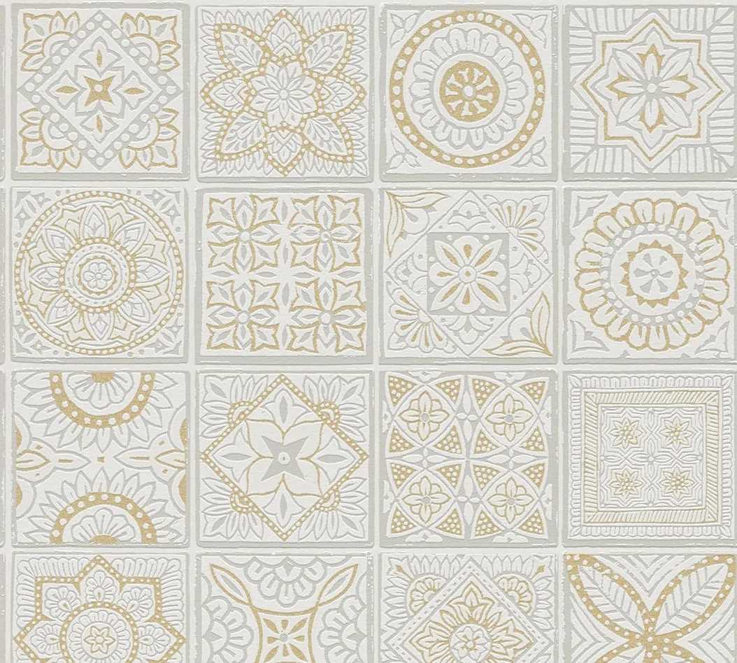 Tapeta 38921-1 Terra AS Creation Tapeta flizelinowa z motywem płytek z kwiatowymi mozaikami - złoto, szarość, biel