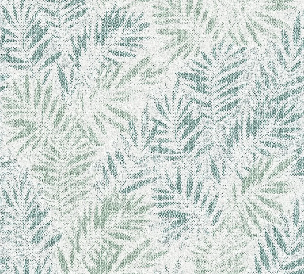 Tapeta 39120-1 Metropolitan Stories. Travel Stories AS Creation Tapeta z wzorem liści z błyszczącą teksturą - biała, zielona