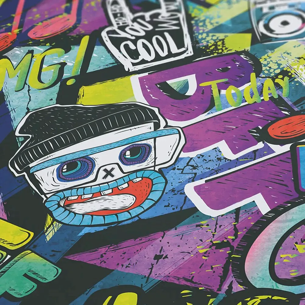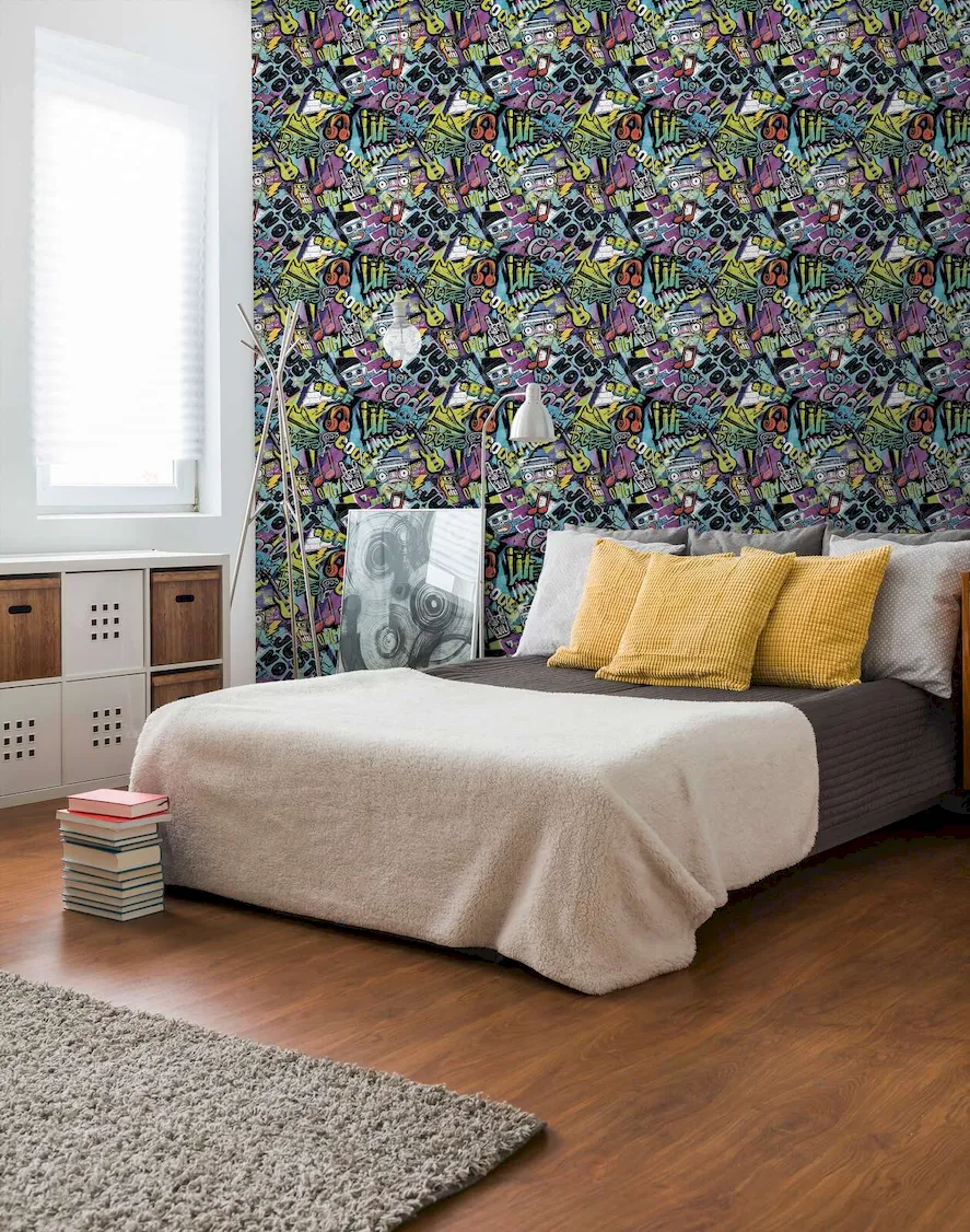 Kolorowa, czarna tapeta w stylu graffiti doskonale komponuje się z różnorodnymi dodatkami i meblami, umożliwiając stworzenie spersonalizowanej przestrzeni, która odzwierciedla indywidualność jej właściciela. Możliwość łączenia jej z innymi kolorami i wzorami sprawia, że aranżacja staje się nieograniczona, a każdy młody człowiek może stworzyć swoje wymarzone miejsce do nauki i relaksu.
