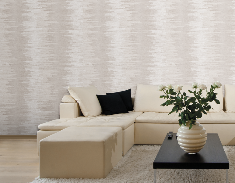 Tapeta ścienna GRANDECO FUSION, zmywalna na flizelinie. Szerokie, pionowe, nierównomierne pasy z efektem rozmycia w beżowych kolorach.