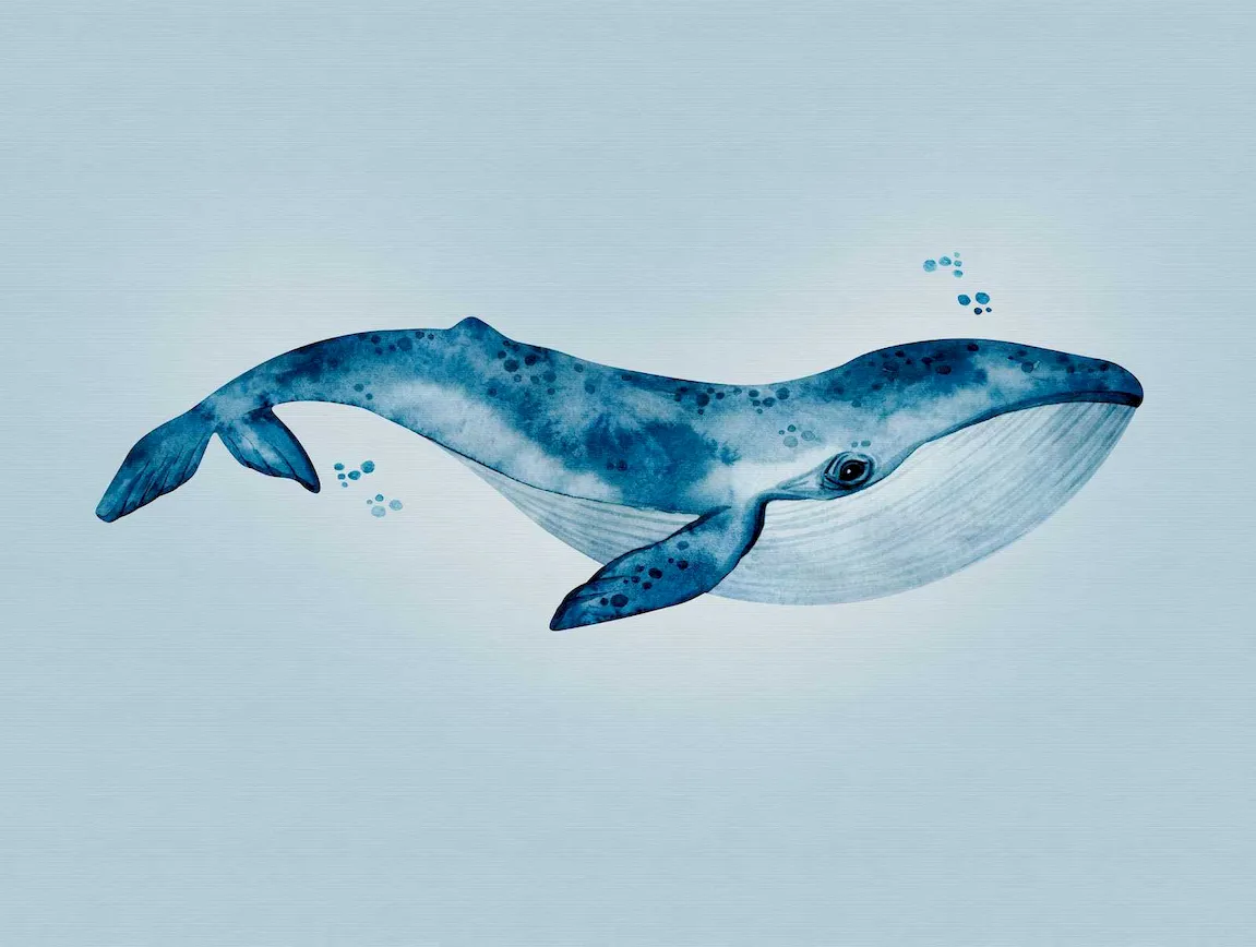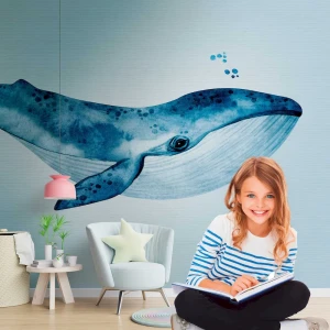 Tapeta podwodna z niebieskim wielorybem w stylu akwarelowym. Tapety motywowe to hybryda zwykłej tapety i fototapety, łącząca duże wzory z zaletami tapety flizelinowej, co ułatwia ich montaż. W sumie 7 pasów tapety tworzy jeden motyw, stając się w ten sposób prawdziwą ozdobą na ścianie.