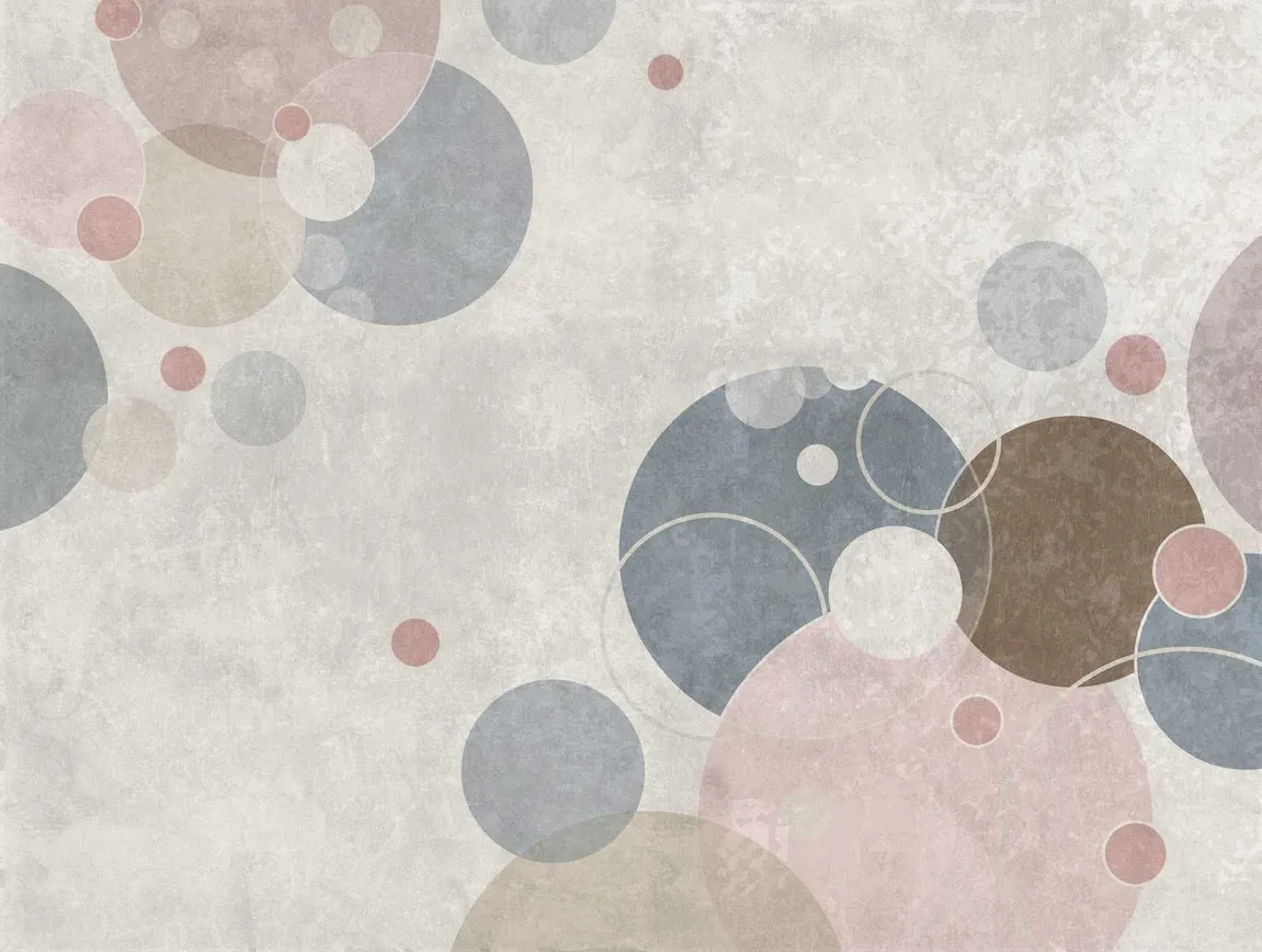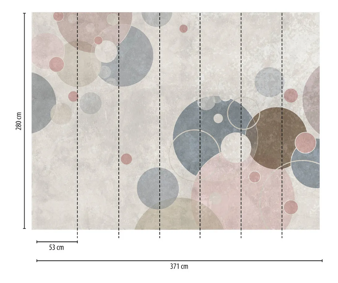 Tapeta graficzna z okręgami i punktami. Duży wzór na jednej rolce – Tapeta motywowa przedstawia rozległy obraz w wyjątkowym stylu i można ją wygodnie nakładać w 7 pasach. Postaw w swojej aranżacji wnętrz na nowy trend tapetowy z projektami zajmującymi całą ścianę, które samodzielnie lub w połączeniu z innymi sprawią, że Twój pokój stanie się miejscem do relaksu.