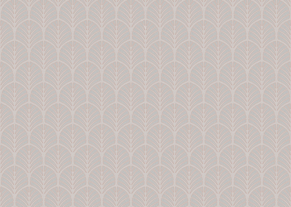 Tapeta Grandeco z kolekcji Myriad. Nowoczesny wzór geometryczny przypominający beżowe wachlarze na popielatym metalicznym tle.
